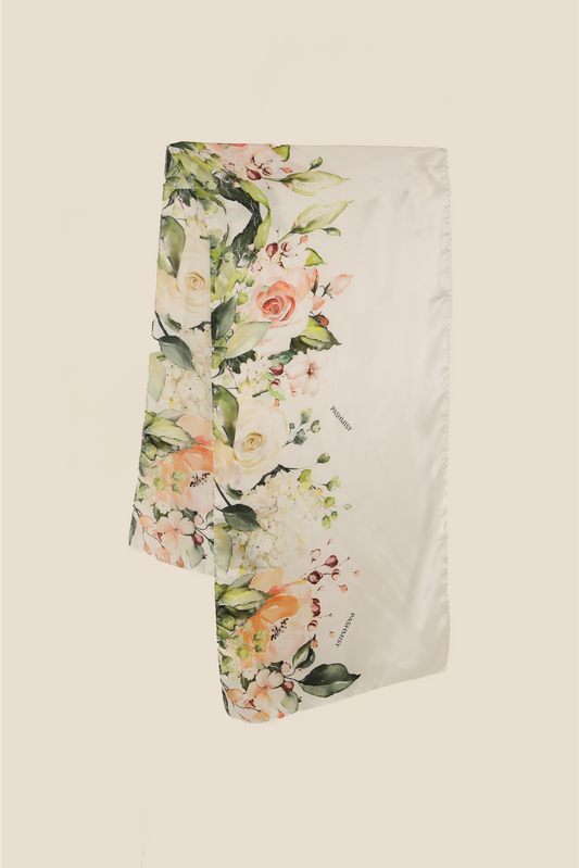 Botanical Elegance Long Silk Scarf in Grey and Ivory