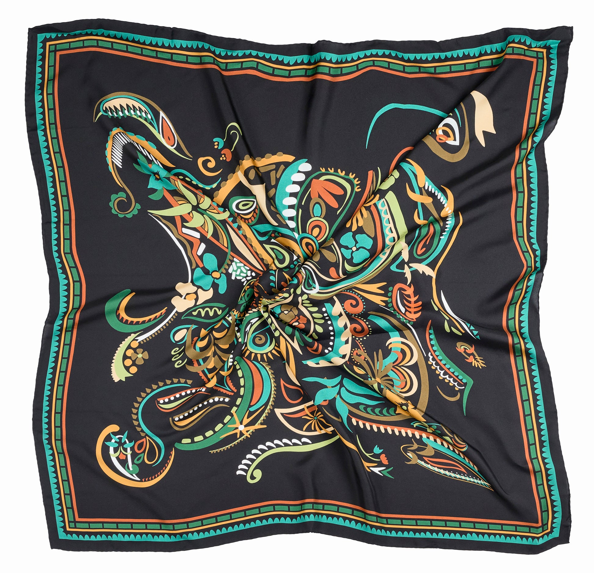 This 100% twill silk square scarf features an intricate ornamental design of swirling florals and paisley-inspired motifs in vibrant shades of emerald green, turquoise, amber, and gold. Framed by a bold black background and a striking border in teal and terracotta, this scarf brings together tradition and modernity in one exquisite piece.