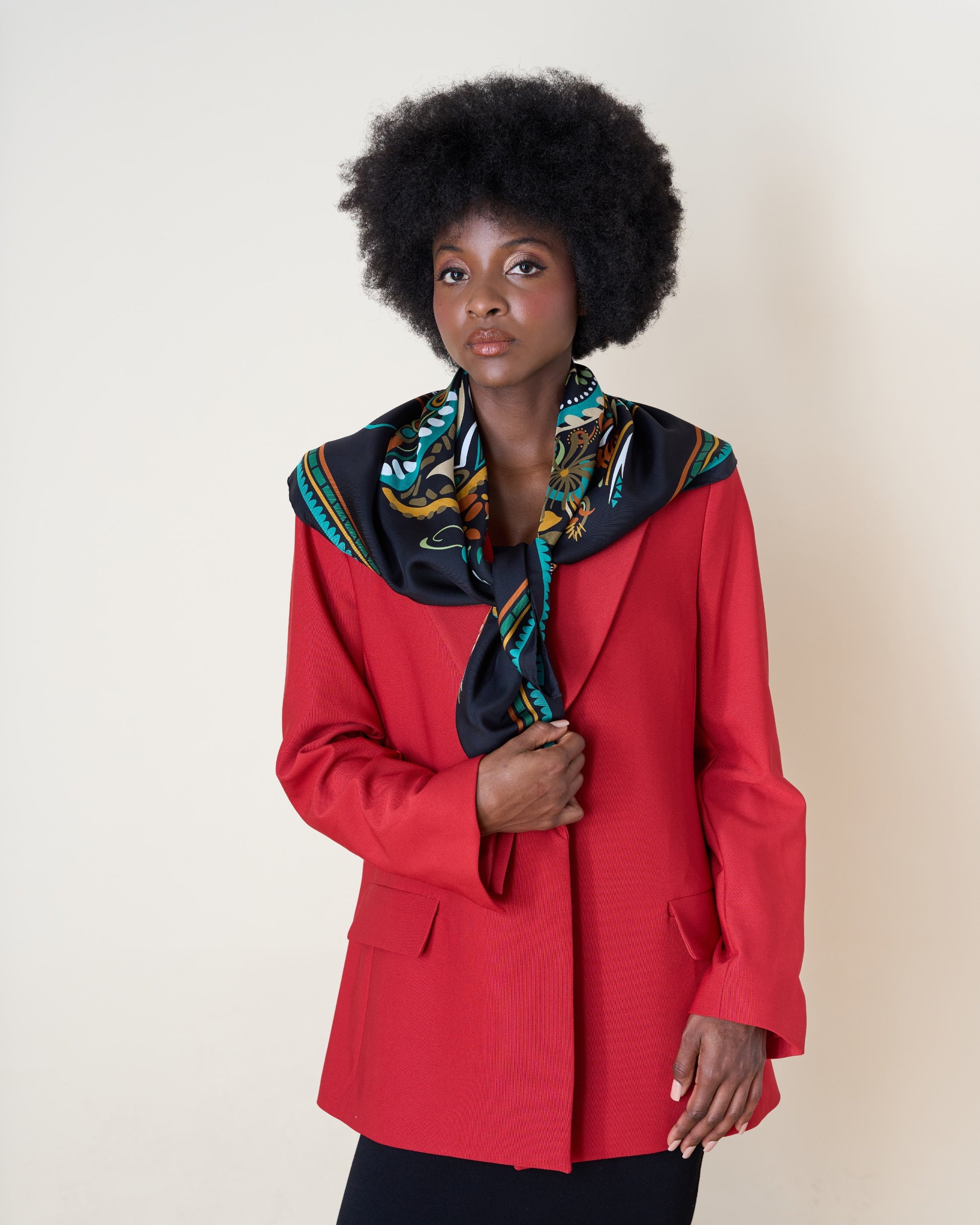 Whether styled with a classic outfit or worn as a bold statement piece, this Italian silk square scarf embodies elegance, craftsmanship, and timeless design.